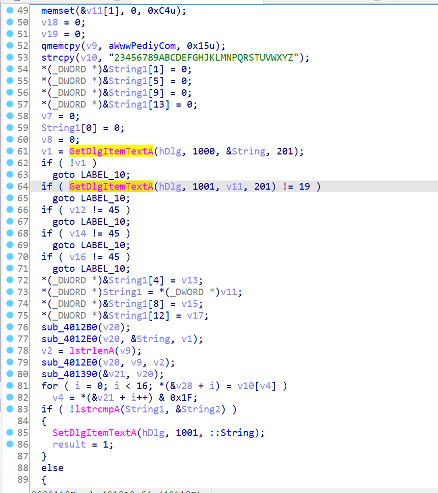 在导入表中找到 GetDlgItemTextA 函数定位关键代码,两次 GetDlgItemTextA 函数读取的应该分别是 NameSerial Number